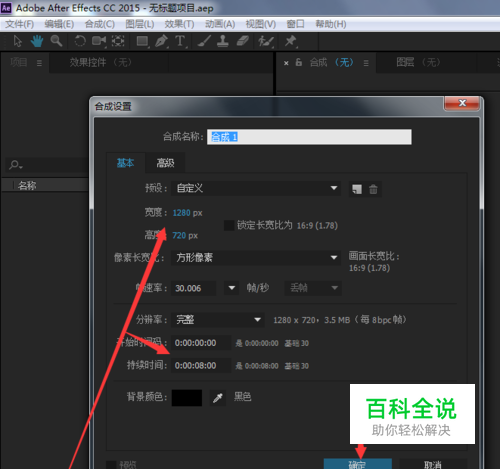 点击菜单栏--文件 --新建项目 然后点击新建合成 宽度1280 高度720 持续时间 8秒 颜色为黑