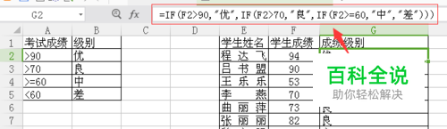 如果使用曾经的IF函数,我们需要好好的的理下思路,需要三层嵌套,才能完成。F2单元格中输入“=IF(F2>90,"优",IF(F2>70,"良",IF(F2>=60,"中","差")))”。向下复制填充公式,得到结果。