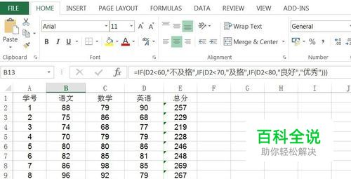 对于If函数的多条件表达,通过嵌套可以来实现.在空白单元格中输入=IF(D2<60,"不及格",IF(D2<70,"及格",IF(D2<80,"良好","优秀"))),点击回车之后会显示"优秀".这个函数要从左到右来看,如果D2小于60分,则返回"不及格";如果大于60分,则返回下一个If函数,在这个函数中,如果D2小于70分,则返回"及格",如果大于70分,则继续返回下一个If函数,在这个函数中,如果D2小于80分,则返回"良好",如果D2大于80分,则返回"优秀".