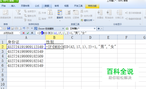 在要计算性别的单元格b2输入公式IF(MOD(MID(A2,17,1),2)=1,"男","女"