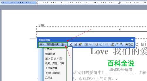 将鼠标移到页眉处,我们选择编辑框的【插入‘自动图文集’】按钮的下拉按钮,如选择创建日期。则会自动为你创建好日期,这日期可以自己修改。