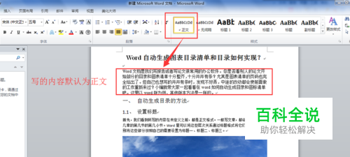 设置标题。首先,我们看到所写的内容在未定义之前,都是正文格式。一般写文章,都会分层次,如第几章的第几节的第几小节。Word里可以将这些层次关系通过标题格式将它们区分开来。分别将这些部分按照自己的需要设置为标题一、标题二、标题三。