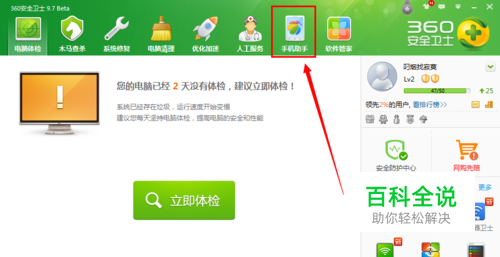 首先用数据线将手机与电脑连接在一起,打开电脑上360安全卫士里的手机助手功能。