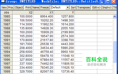 第三步,将y x1 x2以整体组的形式打开,然后view,describetive stats,common sample,可以得到相关系数,由相关系数可以看出x1 x2有较强相关性。