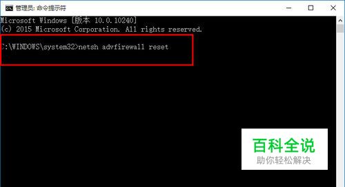 完了后,再次输入:“netsh advfirewall reset” ,回车。