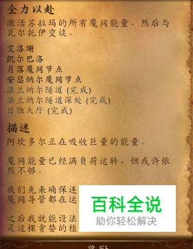 第一个重要任务就是【全力以赴】。完成前提是激活苏拉玛所有的魔网能量。一共七个。分别是:艾洛珊、凯尔巴洛、月落魔网节点、安瑟纳尔魔网节点、法兰纳尔隧道、法兰纳尔隧道深处、日蚀大厅。
