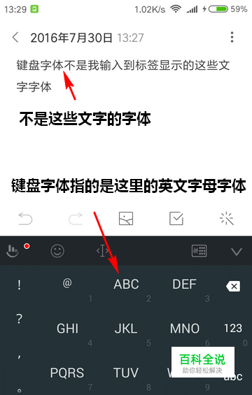 为了不至于让大家误解,我先用一个图示来说明一下手机输入法键盘字体针对的是哪个部分。首先要分清的是,它不是指我们在便签之类的文字编辑器中输出的文字字体(这个通常是系统字体决定的),而是指手机输入法键盘界面上的英文字母字体。