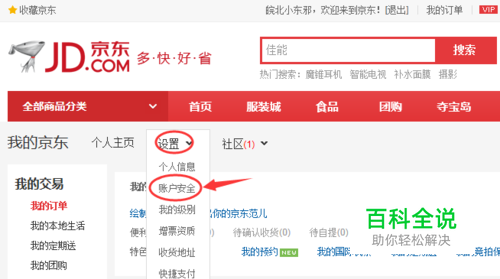 登陆之后,点击“我的订单”进入个人中心,然后在设置的下拉菜单中选择“账户安全”。