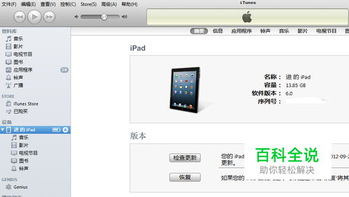 这里以iPad为例。首先把iPad连接到电脑,并且打开iTunes软件,找到左边导航栏中设备,如下图所示