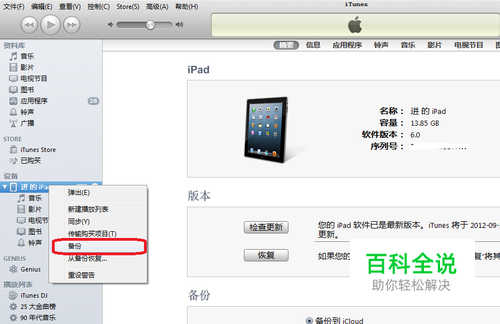 这里以iPad为例。首先把iPad连接到电脑,并且打开iTunes软件,找到左边导航栏中设备。然后选中自己的设备,点击鼠标右键,选择“ 从 备份恢复”,如下图所示