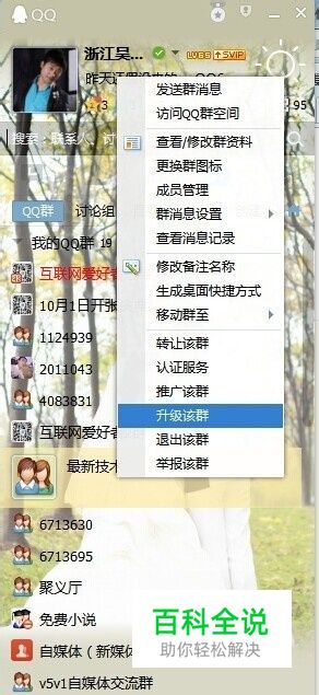 首先要确保你手上有两个以上的自建群,我们暂且假设为QQ群A和QQ群B,现在要把QQ群A合并到QQ群B中去。等等,什么是自建群?顾名思义当然是自己建起来的群,你自己是群主,别人的群不行的哦!满足这个条件的情况下,我们随便选择一个自建群,然后点击右键选择升级该群(当然,我们并不是真的去升级这个群,合并群的功能在这里面,且看我怎么操作。),如图所示: