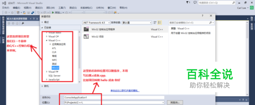 之后会有一个新建项目的界面,左侧有各种语言的编写环境,比如VB,VC#,VC++,我们如果编写C语言就选择VC++,因为c++基本兼容C语言。这时的项目不用添加后缀,这相当于一个大的工程。 选择好类型,写好项目名称之后点击确定。