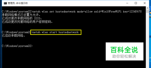 从打开的“命令提示符”窗口中,输入命令 “ netsh wlan set hostednetwork mode=allow ssid=Win10FreeWiFi key=12345678" 并按回车键即可创建一个名为”Win10FreeWiFi”、密码为“12345678”的WiFi热点。