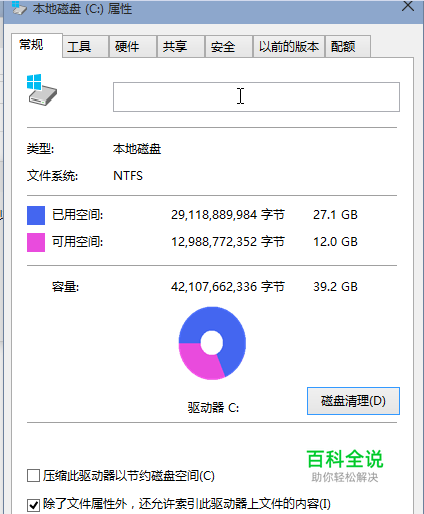 在弹出菜单中选择<常规>选项卡,然后选择如下图位置的<磁盘清理>