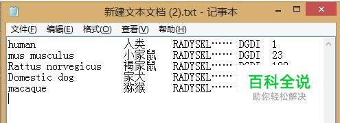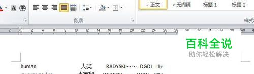 示例:将word中以下的5行内容—包含字符串、文字、字符串、数字分别对齐 human 人类 RADYSKL…… DGDI 1 mus musculus 小家鼠 RADYSKL……DLGDI 23 Rattusnorvegicus 褐家鼠 RADYSKL…… DGDI 128 Domestic dog 家犬 RADYSKL…… DGDI 118 macaque 猕猴 RADYSKL…… DGDI 68