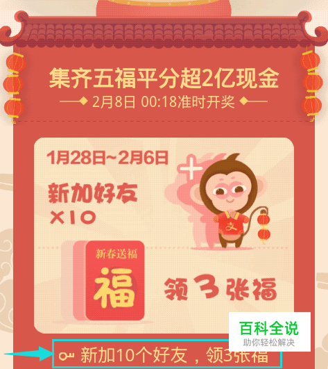第一步:需要 新加10个好友,可以领取3张福字,这个应该是随机领取的,每个人拥有的福字都不能保证完全一样的,都是随机得到的,这样后面才可以相互“换福字”。 第一步的时间范围是 1月28日到2月6日,在这个时间段内新加入10个好友才有效。