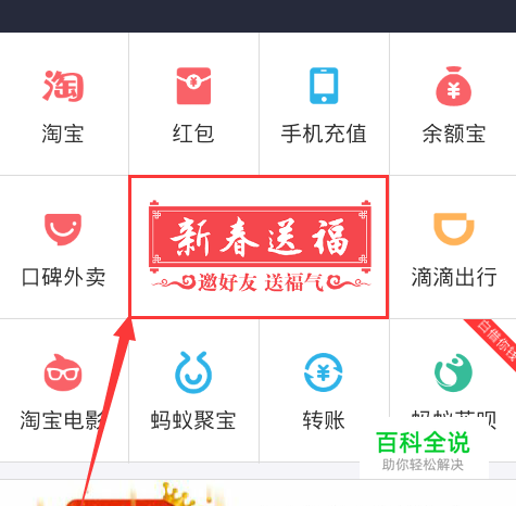 点击 进入【支付宝】的手机版本APP软件,登录自己的支付宝帐号,一进去主页面就会出现 “新春 送福”的字样,在一大堆功能的正中央很扎眼的,手指轻轻一点就可以进入活动了。
