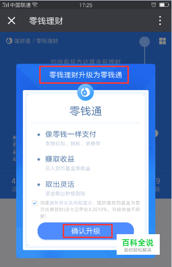 点击下方的【升级为零钱通,随时支付并享收益】,进入到升级界面,如下图所示。