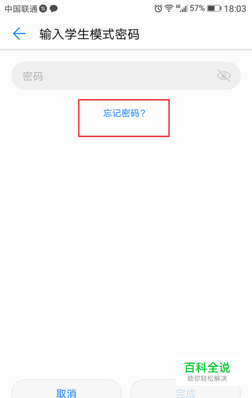 第一步在我们忘记了学生模式设置的密码之后,点击忘记密码,如下图所示: