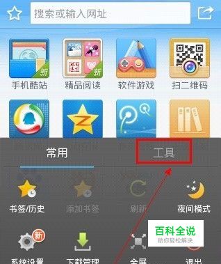 打开手机QQ浏览器,按下手机中的menu键,在打开的菜单中定位到“工具”选项卡。