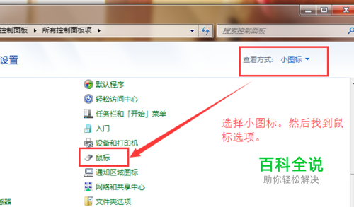 点击选择鼠标选项。进入控制面板界面,调节查看方式为 小图标(小图标可以好看控制面板下的所有的内容,大图标展示一些常用的菜单选项),然后找到 鼠标选项。