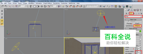 这里我制作了一个模型作为范例。单击(灯光)/【VRaySun】(VR阳光)按钮,在顶视图中单击并拖动鼠标,创建VR阳光,在各个视图中调整一下它的位置,将灯光的【intensity multiplier】(强度倍增器)设置为0.02,【size multiplier】(大小倍增器)设置为5,目的是放阴影的边缘比较虚,参数及位置如下图所示。