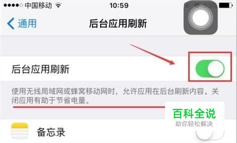 系统默认是开启的,这时候我们可以看到有那些程序会自动刷新,“后台应用刷新”下有提示,使用无线局域网或者蜂窝移动网时,允许应用在后台刷新内容。关闭应用有助于节省电脑,所以我们需要把后台应用设置成关闭状态。