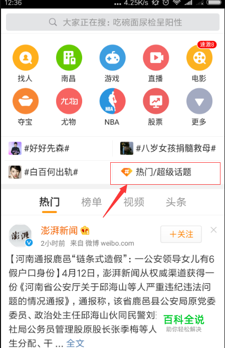 进入发现页面后,我们可以看到“热门/超级话题”,继续点击。