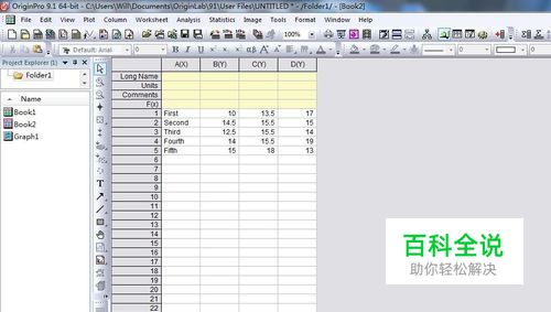 应用预处理数据绘制风玫瑰图步骤如下: 如图为初始数据,数据格式为XY格式。选中工作表中左右数据,然后执行Plot-Specialized-Wind Rose-binned Data命令,或单击2D绘图工作栏中的按钮。