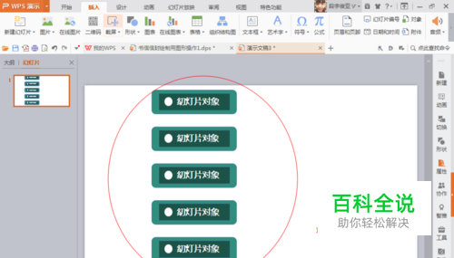先绘制一个圆角矩形,置于最底层,填充淡绿色,然后绘制一个矩形,填充深绿色。将其两个图形全部选中,进行水平居中分布。分布按钮是在WPS演示文稿中按下鼠标右键进行分布。