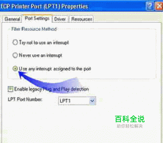 在“我的电脑”的“设备管理器”中的“端口”选项下,将 LPT1 端口设置从 “一定不要使用中断” 更改为 “使用指派给此端口的任何中断” 。 这将使驱动程序能够使用 LPT1。