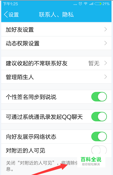 第三步,下方有一个叫做“对附近人可见”这个功能的开关,我们关闭此功能,就是点击一下右方对应的开关。