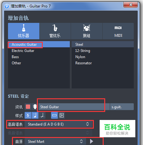 Guitar Pro日益成为一款成熟的吉他音乐制作软件,软件支持多种语言,拥有上千种在线标签,可以用多个工具、MIDI工具,包括你喜欢的乐器快速作谱。 1、建立新档:可以选择弦乐器种类Acoustic Guitar,STEEL设定为Steel Guitar,高音谱表默认标准,音源为Steel Mart,建立。