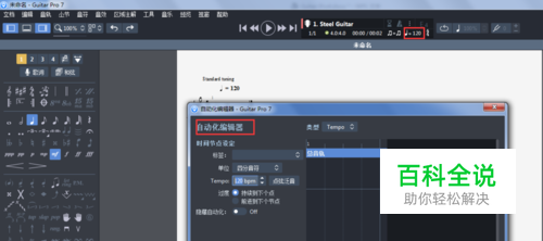 2、设置速度:点击工具栏J=120,弹出自动化编辑器,选择标签Freely,单位四分音符,Tempo默认120bpm。