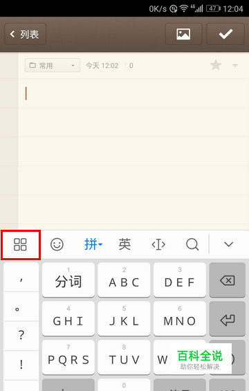 首先,将手机联上网,再随便打开一个文字编辑器,调出百度输入法华为版。等到出现输入法的面板以后,点击面板左上角的那个方格图标。