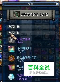 设计图上要求收集无色大晶体,斯卡迪女王的印章,坚硬的铁片,辛达的铁匠铺使用券和下级元素结晶,一般要求制作的物品我们都可以找NPC罗杰制作;