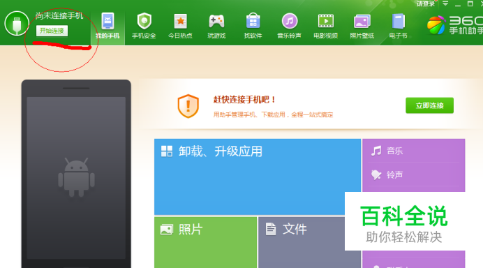 用手机数据线吧手机和电脑连接在一起后,会出现下面的界面,点击--马上管理手机,之后出现另外的界面。点击左上角的开始连接。