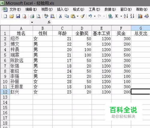 首先打开我们的表格,员工的工资我们按照全勤奖+基本工资+奖金来算。