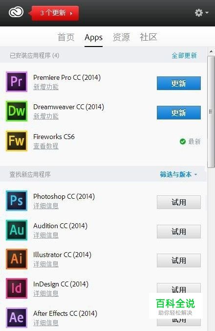 首先从adobe的英文官方网站下载creative cloud,完成安装,用注册ID登录就可以更新和下载试用。
