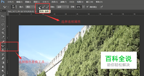 打开PhotoShop软件,选择颜色替换工具,顶部选择连续取样,如下图所示