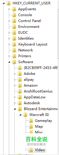 在弹出的注册表编辑器的左侧依次选择HKEY_CURRENT_USER --> Software --> Warcraft III --> Video 。