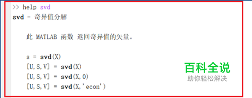 第一步我们首先需要知道在matlab中求矩阵的奇异值是用svd函数,在命令行窗口中输入“help svd”,可以看到svd函数的使用方法,如下图所示: