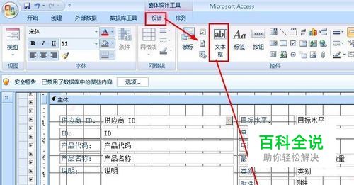 打开设计视图以后,在【设计】选项卡下,选择文本框,然后点窗体中点击一下,这样就添加了一个无数据源的文本框。