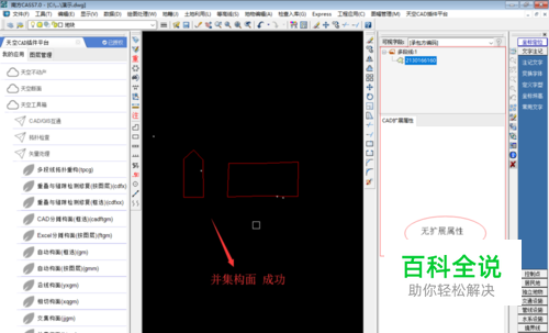 3、我们框选好要处理的数据后,点击键盘上 回车键。 通过查看图形,我们可以发现该功能已经成功将存在交集或共线的闭合多段线进行合并了,并形成了独立的闭合多段线。同时,我们通过查看执行该功能前的图形属性和执行该功能后的图形属性,可以发现执行“并集构面”功能生成的闭合多段线是没有属性的。 如果您需要对这些执行并集构面功能生成的闭合多段线录入属性,可以使用天空工具箱中的框选批量赋属性功能或导入Excel到CASS宗地属性功能。