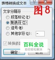 在弹出的“表格转换成文本”对话框中我们选择默认设置,当然你也可以试试其他的选项哦。然后点击确定。如图8所示。