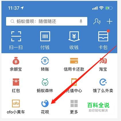 打开支付宝,在主界面中找到花呗应用,点击进入。