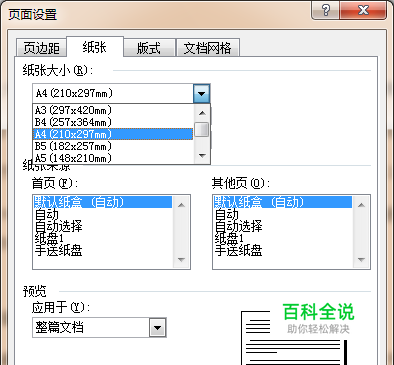 在纸张大小这里选择需要的纸张,下面显示所选纸张的大小。
