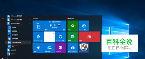 启动Windows 10操作系统,如图所示。点击任务栏"开始"按钮,弹出开始菜单选择"Windows 系统→文件资源管理器"项。