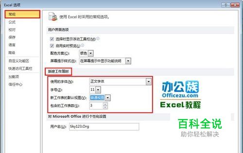 在弹出的“Excel选项”中选择“常规”,在“新建工作薄时”选项框中选择要设定的新建Excel格式数据,按“确定”按钮即可。
