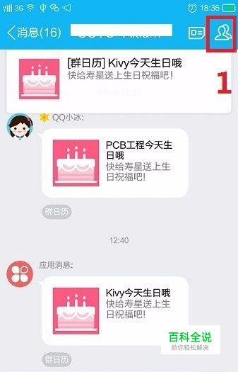 首先,打开手机客户端的QQ,然后打开所要分享的群,然后点击其右上角icon(红框1);